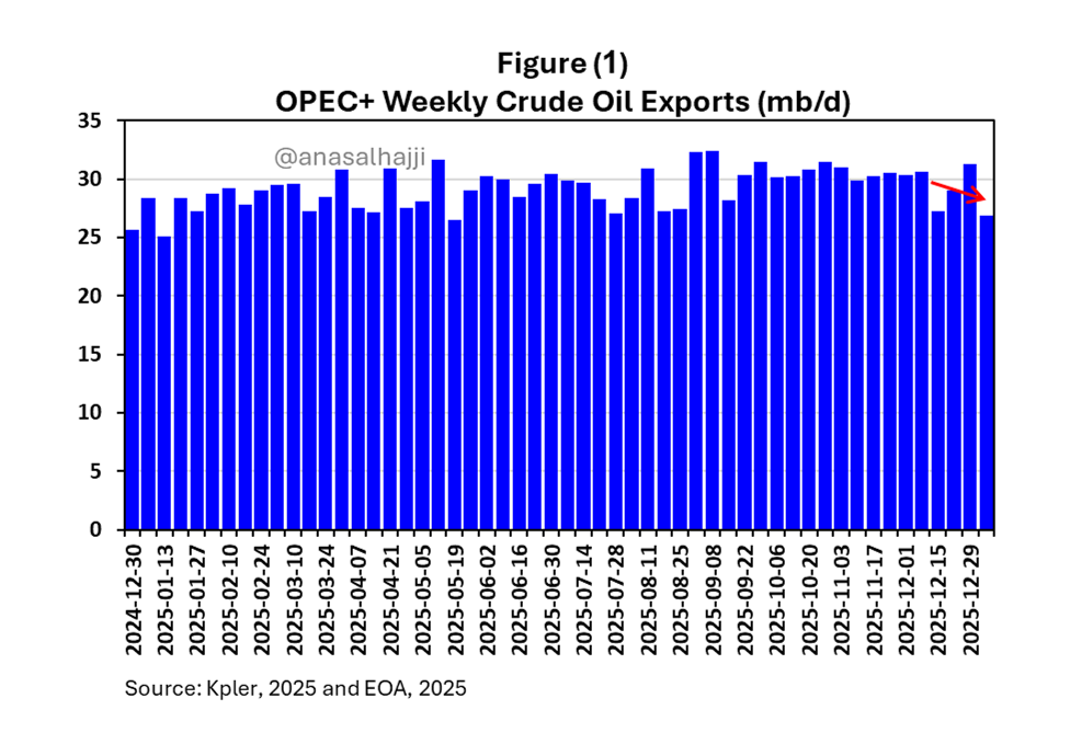 OPEC+ production and exports declined in December. Weekly data from Kpler shows that OPEC+ continued to decline in the first two weeks of January.