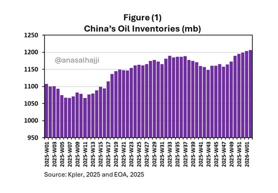 The increase in China’s oil inventories since the beginning of 2025 was 98.7 mb.